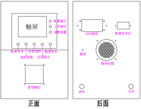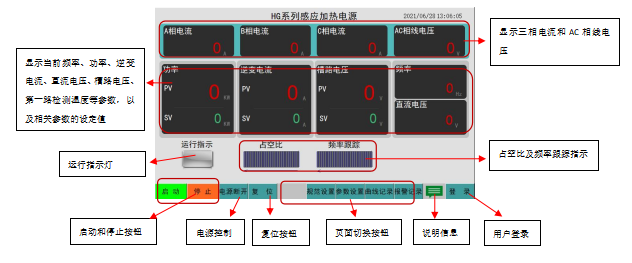 “復位”:當感應加熱電源出現(xiàn)錯誤后提示故障原因,在排除故障后,可點擊此鍵進行復位;